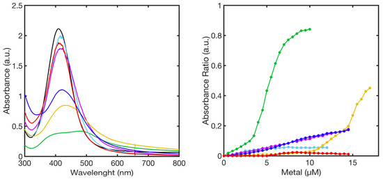 SPABs of PL2-AgNPs@11MUA (black line) obtained at the highest concentration of metal ions (left-panel), calibration curve showing the relationship between absorbance ratio and metal ions concentration used in the titrations (right-panel). Ni2+ (green line), Mn2+ (blue line), Cu2+ (red line), Zn2+ (cyan line), Co2+ (purple line), and Cd2+ (yellow line).