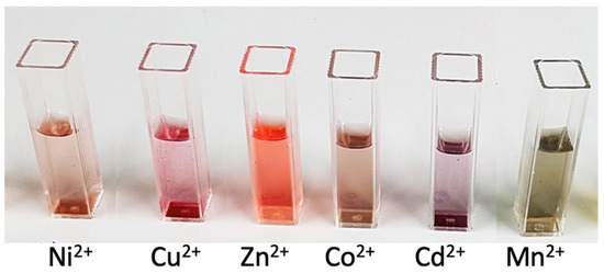 Next, the resulting colloidal suspensions were individually titrated with a selection of the most common metal ions present in wastewater (namely, Ni2+, Zn2+, Co2+, Cd2+, Mn2+, and Cu2+) and the consequent variation in SPABs was followed using UV-Vis spectroscopy.