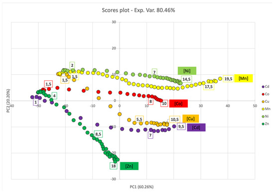 The scores plot (Figure 11) showed a shift for all metal ions towards higher PC1 score values by increasing the concentration, due to the decrease and increase in the first and second SPAB, respectively. The shift along the PC1 axis also reflected the behavior of the titration curves reported in Figure 9 (right panel), since it followed the same trend with a higher shift in the “intermediate zone”. Additionally, the PC1 score also evidenced that the optimal sensing zone depended on the type of metal ion added to the PL1-AgNPS@11MUA. PC2 instead discriminated the metal ions mainly on the position of the second SPAB; in fact, those metal ions that generate secondary well-resolved SPABs (and do not cause a high enlargement of the first SPAB), were placed in the bottom part of the score plot. This behavior was found for Zn2+, Cd2+, and Cu2+. Conversely, those metals that did not show a second well-resolved SPAB, such as Ni2+, Mn2+ and, to a lesser extent, Co2+, were in the top part of the plot.