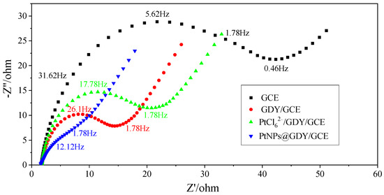 The impedimetric characteristics of bare GCE, GDY/GCE, PtCl62−/GDY/GCE, and PtNPs@GDY/GCE.