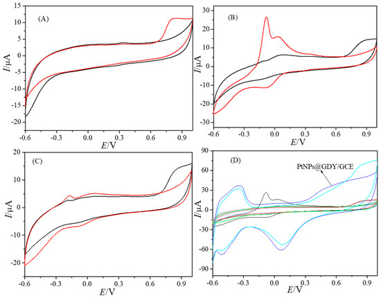 CVs of the bare GCE (A), GDY/GCE (B), PtCl62−/GDY/GCE (C), PtNPs@GDY/GCE and the above three modified electrodes (D) in 0.1 M PB with the absence and presence of 0.5 mM BPAF.