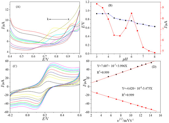 DPVs of PtNPs@GDY/GCE in 0.1 M PB with 0.5 μM BPAF at different pH (from a to k: 3.0 to 8.0) (A); The relationship between pH and peak currents and peak potentials (B); CVs of PtNPs@GDY/GCE in 5 mM K3[Fe(CN6)] solution with 0.1 M KCl at different scan rates (10, 30, 50, 70, 100, 130, 150, 170, 200 mVs−1) (C); The relationship between peak currents and square root of the scan rates (D).