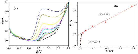 Under the optimum conditions, the response of the PtNPs@GDY/GCE to BPAF was studied by the DPV method (Figure 5A). The results showed that the peak current increased with the increase of the concentration of BPAF and showed a two-stage linear relationship (Figure 5B). The linear equations were Ip = 1.05 × 10−5 + 0.098C (R2 = 0.946) and Ip = 1.21 × 10−5 + 0.0059C (R2 = 0.995) with the linear range of 0.4–15.4 μM and 35.4–775.4 μM. According to the formula LOD = 3 S/m [24]. Where S is the standard deviation of peak current, m is the slope of linear equation. The LOD was 0.09 μM. The oxidation mechanism for BPAF can refer to the report of Wang [1] and Chan [25].