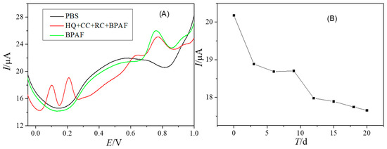 After the modified electrode was prepared, it was placed in the refrigerator at 4 °C for 20 days. During this period, 0.5 μM BPAF was tested by DPV every 3 days. The results showed that the peak current remained between 87.5% and 93.6% of the original peak current (Figure 6B). This indicated that the modified electrode had good stability.