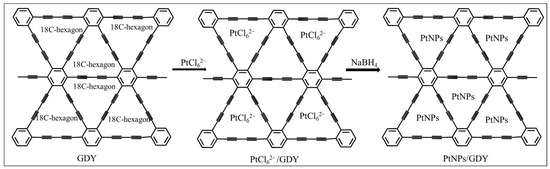 Graphdiyne (GDY) is a new allotrope of 2D carbon nanostructure as a big network of diacetylenic linkages, with the configurations composed by six carbon hexagons (6C-hexagon) like graphene and eighteen carbon hexagons (18C-hexagon) [15]. GDY has good conductivity and semiconducting behavior. Because of its unique structure and properties, GDY has been widely used in various fields, such as catalysis and battery and energy storage [16,17,18]. Recently, it has been reported that GDY possesses adequate sp-hybridized carbon that may coordinate with metal atoms and dock them on the surface of GDY [19].