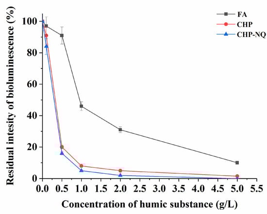 Decrease in the intensity of bioluminescence of firefly luciferase with an increase in the concentration of HS: FA—fulvic acids; CHP—potassium humate; CHP-NQ—potassium humate modified with naphthoquinone.