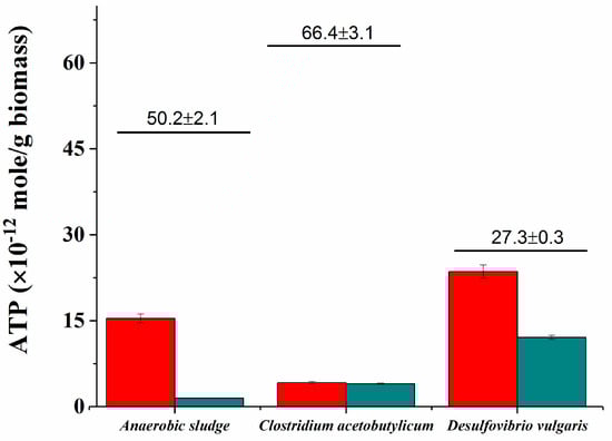 It was found that after exposure of anaerobic sludge for 24 h in media containing the tested extagents with dissolved oxidized sulfur compounds, the concentration of intracellular ATP decreased most significantly when acetonitrile, DMFA, and N-methylpyrrolidone were added to the sludge compared to the control (based on an aqueous medium). In the presence of ethanol and isopropanol, a slight positive change in the level of ATP was observed in comparison with the control [73]. Immobilized cells, as expected, had a higher residual level of intracellular ATP in comparison with suspension cells. In general, the changes in the concentration of intracellular ATP observed over 24 h indicated that ethanol and isopropanol are the most appropriate of the whole range of potential extractants for the hybrid biotechnological process under development involving anaerobic biocatalysts in the form of active sludge [72]. Further, it was found that hydrolysates of microalgae Chlorella vulgaris biomass remaining after lipid extraction, as well as glucose, are a co-substrate suitable for biogas production in the presence of oxidized forms of organic sulfur-containing compounds. During the biotransformation of BTO2 both with wastewater containing residual glucose concentrations and with biomass hydrolysis of microalgae Chlorella vulgaris cells, the concentration of intracellular ATP decreased in all studied biocatalysts. At the same time, the degree of influence of BTO2 on various anaerobic cells was different. The maximum negative effect of the presence of sulfone in the medium was noted for the cells of sulfate-reducing bacteria Desulfovibrio vulgaris. At the same time, the presence of BTO2 at a concentration of 0.15 mM had practically no negative effect on the viability of Clostridium acetobutilycum cells [70].