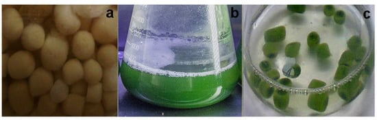 Photos of immobilized mycelial fungi of R. oryzae (a), and accumulating suspension of C.vulgaris cells (b) in the medium with the immobilized mycelial fungous cells, when the immobilized inoculum of microalgae C. vulgaris cells (c) are loaded into the same broth.