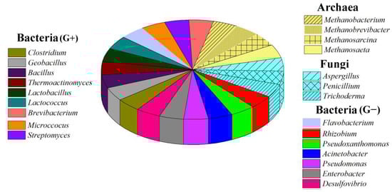 Despite the taxonomic diversity due to the substrates and conditions of consortium formation, several microorganisms can be identified that occur in the prevailing majority of cases. Stable participants are bacteria of the genera Pseudomonas, Clostridium, Enterobacter, Bacillus, Lactobacillus, Desulfovibrio, and Flavobacterium and archaea of the genera Methanosarcina, Methanobacterium, Methanobrevibacter and Methanosaeta (Figure 4). It is quite obvious that the palette of participants in methanogenic communities is very wide. Therefore, the selection of substances and their combinations for suppression of methanogenesis carried out by natural very complex consortia is interesting and important for investigation.