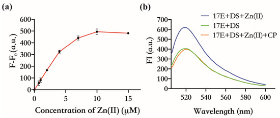 Both CP and 17E DNAzyme have already been proven to have an affinity for Zn(Ⅱ) [25,26,27]. In principle, CP can indirectly inhibit the activity of 17E by binding to Zn(Ⅱ) competitively with 17E. As shown in Figure 2a, there was an obvious FI enhancement when the mixtures of 17E and DS were incubated with different concentrations of Zn(Ⅱ), in contrast to those without Zn(Ⅱ). The FI increased with the increasing amount of Zn(Ⅱ) (0~10 µM), and the maximum slope of the curve was obtained at the concentration of 4 µM, which is the concentration that will be used for the subsequent feasibility test. This concentration-dependent manner implies that Zn(Ⅱ) is a necessary cofactor for 17E. When CP with half the concentration of Zn(Ⅱ) was added, which was the saturation concentration expected to bind exactly all the Zn(Ⅱ) (4 µM) in the system, the FI was almost the same as that of without Zn(Ⅱ) (Figure 2b). These results confirm that CP does suppress the enzymatic cleavage of DS by sequestering the Zn(Ⅱ) necessary for the activity of 17E.