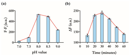 Based on the sensing principle, the more sensitively 17E responds to variations in the concentration of unbound Zn(Ⅱ), the better the above assay will perform in the detection of CP. We further investigated the response of the FL of DS to Zn(Ⅱ) under different reaction parameters, such as pH value and the reaction time of enzymatic cleavage. As shown in Figure 3a, the maximum difference of FL between the 17E/DS mixtures, with or without Zn(Ⅱ), was observed at pH 8.0. It is indicated that a certain amount of Zn(Ⅱ) can induce the maximum cleavage of DS at pH 8.0. Thus, we selected a buffer with a pH of 8.0 for the subsequent experiments. Although the higher level of Zn(Ⅱ) can stimulate faster cleavage of DS, with the extension of the reaction time, the cleavage reaction would reach the endpoint regardless of zinc(Ⅱ) concentration, meaning all substrates have already been cleaved. As we will use 4 µM of Zn(Ⅱ) in the detection of CP, we choose 4 µM and 1 µM as the high and low levels of Zn(Ⅱ), respectively, to determine the time in which the maximum fluorescence intensity difference (ΔF) between them was achieved (Figure 3b). Finally, we determined 30 min as the cleavage time. These optimized experimental conditions are applied to the following operation.