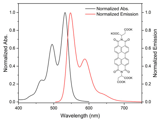 The designed fluorophore molecule, APBI-K, is highly water soluble due to its salt form (Scheme 1). Such high-water solubility is essential for the sensor to be used in a pure water system. The optical properties of free APBI-K were studied by measuring absorption and emission spectra in water at room temperature. As shown in Figure 1, the normalized spectra of APBI-K show two strong absorption bands near 532 nm, 495 nm along with a broad shoulder peak around 465 nm. This typical characteristic absorbance could be assigned to the 0–0, 0–1, and 0–2 transition energy [36,37,38]. The emission spectra of the same solution portray the similar structural features with nearly mirror images of the absorption spectra, and the emission peaks appear at 547 nm, 587 nm, and a weak shoulder peak near 638 nm.