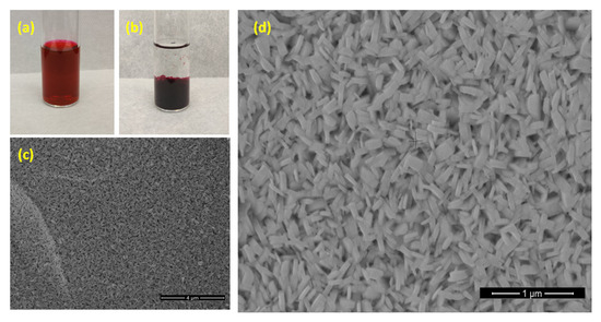 Coordination induced self-assembly was studied by using aqueous solutions of APBI-K and Cu(NO3)2. When Cu2+ was introduced into the APBI-K solution at a 10:1 molar ratio, a rapid precipitate formation was observed, which confirms the water-soluble fluorophore molecules undergo a fast coordination complex formation with Cu2+ ion. A clear supernatant solution was observed after standing overnight, confirming the completion of the process (Figure 2a,b). The SEM imaging confirms the nanorod morphology of the self-assembled APBI-Cu precipitates (Figure 2c,d). Another set of self-assembled precipitates was obtained from the same APBI-K solution by evaporating the solution without adding any Cu2+ ion solution. No distinct morphology was found for only APBI-K material (Figure S1, Supplementary Materials). This result suggests that Cu2+ ion coordination is important to obtain monodispersed nanorods.
