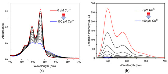 The change in absorption (a) and emission spectra (b) of APBI-K aqueous solution during formation of coordination induced self-assembly with incremental addition of Cu2+ ion.