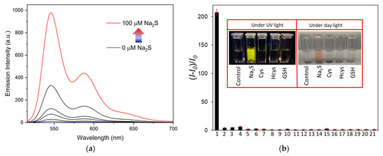 To test the sulfide sensing ability of APBI-Cu nanorods, the nanorods were dispersed in water and an aqueous solution of Na2S was added incrementally. As depicted in Figure 4a, a rapid turn-on fluorescence signal was observed in the presence of sulfide in the system. The spectral pattern is the exact same as free APBI-K molecules. A time-dependent study shows that the turn-on signal gets saturated within 120 s (Figure S3, Supplementary Materials). Such a fast response is desirable for rapid onsite sensor development. In the presence of sulfide, the color of the solution also changes to red with the reappearance of typical 0–0 and 0–1 transition peaks in UV-Vis spectra (Figure S4, Supplementary Materials). A change of pH was also observed during the sensing experiments. The pH of the system changes from 5.4 to 7.8. Thus, to stabilize the pH of the system, a same experiment was carried out in 10 mM HEPES buffer at pH 7.4. As shown in Figure S5, APBI-Cu nanorods can detect the sulfide in buffer medium efficiently. Hence, the spectral study in both water and buffer medium confirm the sulfide sensing ability of APBI-Cu nanorods.