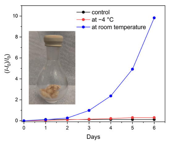 As it spoils, meat produces a high amount of sulfides via the degradation of proteins [70,71]. In such cases, sulfide can act as a marker of meat spoilage [72]. Chicken mince was kept at room temperature and another set of meat was stored at −4 °C. The collected gas from the headspace of the flask was slowly bubbled in the aqueous suspension of APBI-Cu nanorods. Emission spectra were then recorded. No remarkable turn-on signal was observed in the initial 2 days from both samples. A detectable turn-on signal was observed from the meat stored at room temperature after 3 days. As shown in Figure 7 and Figure S33, Supplementary Materials, the turn on signal increased with time. On the other hand, no turn-on signal was observed for the gas collected from the headspace of the chicken-containing flask stored at −4 °C, which indicates that the meat remained fresh and was not undergoing spoilage. No turn-on signal was observed when only air was bubbled in the aqueous suspension of APBI-Cu nanorods as a control experiment. In addition, when APBI-Cu nanorods coated paper was placed on fully spoiled meat, a rapid color change was observed with an enhanced fluorescence signal under UV-lamp (Figure S34, Supplementary Materials). These observations suggest that the APBI-Cu nanorods can be utilized as an indicator of raw meat freshness via monitoring the released sulfide from the meat sample.