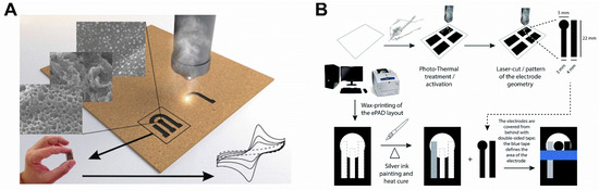 (A) Schematic representation of the laser manufacturing process of LSG-based electrodes made on paperboard [3]. License number: 5432010483088 (B) Graphic representation of the manufacturing steps and laser treatment of electrodes prepared by the pencil drawing technique. Adapted with permission from [17].