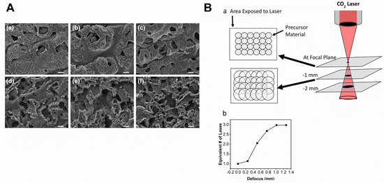 (A) Scanning electron micrograph images of the N doped-LSG electrodes after laser scribing process using laser power of (a) 2.8%, (b) 3.2%, (c) 3.6%, (d) 4.0%, (e) 4.4%, (f) 4.8%, all the scale bars are four μm. Reprinted with permission from [34]. Copyright 2020 American Chemical Society (B) (a) The diagram shows defocus effect by increasing laser spot size. No dot overlapping was seen at low DPI (less than 150) and in the focal condition. Increasing the defocus caused more overlap due to larger point sizes, causing numerous exposures. The defocus condition can also be achieved by moving the substrate above or under the focal plane. (b) The equivalent number of laser exposures at various defocus ranges. Reprinted with permission from [8]. Copyright 2018 American Chemical Society.