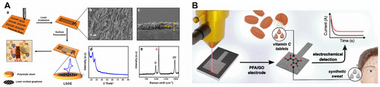 (A) (a) Graphic description of the manufacture of LSG based on laser scribing of the PI substrate under inert gas condition; (b,c) Scanning electron micrograph image of the resulted LSG and cross-section of LSG electrode; (d) X-ray diffraction spectrum of LSG device; (e) Raman Spectrum of LSG electrode [36]. License number: 5432021450144 (B) Direct laser engraving of graphene oxide-biomass-derived poly(furfuryl alcohol) electrode for non-enzymatic electrochemical detection of ascorbic acid in vitamin C pills and synthetic sweat [42]. License number: 543203029591.