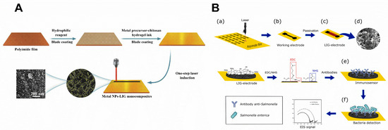 One-step silver nanoparticle-modified LSG was reported. A defocused laser scribing method was used. Previously, the PI film was treated with an ultraviolet laser to create roughness and, thus, increase its wettability. Then, AgNO3 solution was drop-cast on the PI film and dried in the air. The dried film was then treated by laser process, with a power of 4.2 W, step size of 1064 nm, and scan rate of 50 mm s−1, to produce LSG modified with Ag [35]. In a similar approach, a hydrogel ink, made of chitosan and a solution of HAuCl4, AgNO3, or H2PtCl6, was utilized to coat PI film, and, after drying, a laser was scribed to modify LSG with nanoparticles (Figure 4A) [51].