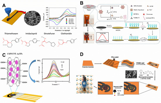 Pesticides are synthetic or natural chemicals or mixtures thereof used to control, reduce, or prevent weeds, diseases, and pests that affect vegetable growth [81]. An LSG sensor was used for rapid detection of neonicotinoid pesticides without needing electrode chemical/biological modification on agricultural runoffs and along watersheds aiming to help make guideline policies about the usage of pesticides at a given time and place (Figure 5A) [14]. Neonicotinoids, including imidacloprid (IMD), thiamethoxam (TMX), clothianidin (CLO), and dinotefuran (DNT), act by affecting the acetylcholine neurotransmitter controlling a range of sucking and chewing pests that spoil croplands, home yards, and golf courses. Nevertheless, extensive usage has affected non-target organisms, including various aquatic species, birds, and honeybees. The long-term effects on humans and ecosystems are still inconclusive, due to inadequate appraisal of exposure to neonicotinoids. The sensor showed promise exhibiting low LOD of 823 nM, 384 nM, 338 nM, and 682 nM for CLO, IMD, TMX, and DNT, respectively, suitable reproducibility and no significant interference from broadly used pesticides and herbicides, such as parathion, paraoxon, fipronil, glyphosate, atrazine, dicamba, and 2,4-dichlorophenoxyacetic acid. The LSG sensor responded linearly in a concentration range of 10−40 μM and presented recoveries of 91.8−108.5% in river water.
