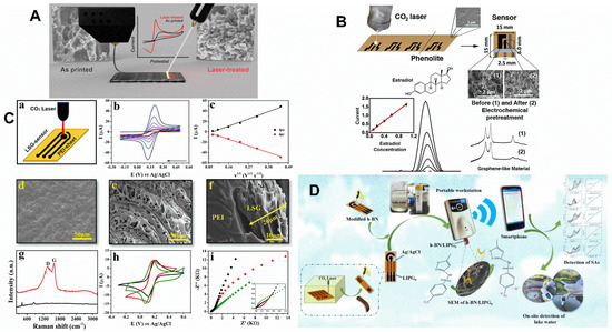 Alternatively, Mendes et al. used phenolic papers, a resilient, cheap, and non-conductive commercial material comprised of wood fibers, as an alternative for local pyrolysis by laser scribing, due to better physical and mechanical resistance and stability than papers during analysis (Figure 6B) [38]. The resulting LSG electrodes could be promptly used as electrochemical transducers; nevertheless, they were subjected to electrochemical treatment to enhance electrochemical properties, which provided great conductivity and low charge transfer resistance [38]. The electrodes afforded lower ΔEp and Rct than the electrochemically untreated electrodes. Furthermore, it provided lower LOD (0.094 μmol L−1) for β-estradiol hormone than the GCE (12.1 μmol L−1). The process of fabrication using phenolic paper revealed good reproducibility and repeatability with RSD of 4.9% (n = 10) and 2.8% (n = 50), respectively.
