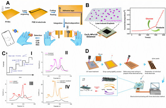 (A) Graphic illustration of finger LSG flexible electrochemical detection system to detect chloramphenicol (CAP), ractopamine (RAC), and clenbuterol (CLB) in pork and milk. Adapted with permission from ref. [1]. License Number: 5411970964877. (B) A representation illustration of a manufactured flexible Co3O4 NPs-LSG sensor and its amperometric response to glucose with several concentrations at an applied potential of +0.55 V [68]. License number: 5432031071827 (C) (I) DPV parameters used to yield the best analytical response at these electrodes. (II) DPVs of AA, DA and UA in 0.1 M PBS pH 4 at untreated (black), anodized (pink), (III) lasered (red), and (IV) lasered-anodized (orange) commercial carbon SPEs. All the voltammograms were obtained against Ag pseudo-reference electrode. Adapted with permission from ref. [89]. License Number: 5411980160451. (D) Schematic diagram of the fabrication and application of the LSG@Ag electrode on hydrogen peroxide sensing. Adapted with permission from ref. [35]. License Number: 5412001392675.