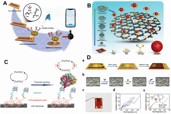 A cationic polymer, such as polyallylamine rich in amine groups, can also be used to coat the LSG for antibody immobilization. They were anchored through EDC/NHS to allow biomarker detection (Figure 4B) [71]. A direct immobilization of anti-Salmonella on LSG through EDC/NHS was also reported. [15] On the other hand, direct immobilization of antibodies on the Au-modified LSG without using EDC/NHS was reported where a drop of a solution of goat anti-E. coli O157:H7 antibody was added to the electrode and incubated overnight at 4 °C [51].