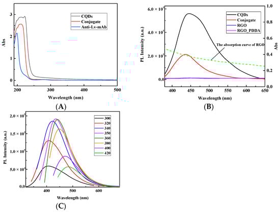 The UV-Vis absorption spectra of Anti-Lv-mAb, CQDs, and conjugate (Anti-Lv-mAb/CQDs) were illustrated in Figure 4. CQDs indicates a strong absorption at 230 nm, corresponding to the π→π* transition of the aromatic group; the Anti-Lv-mAb presents an absorption peak at 200 nm; the absorption peak of the conjugate is at 210 nm, positioned between 230 nm and 200 nm, and the intensity of the conjugate is higher than that of Anti-Lv-mAb and lower than that of the CQDs. We guessed the Anti-Lv-mAb was conjugated with CQDs successfully. The PL spectra of CQDs, conjugate, RGO, and RGO_PDDA were shown in Figure 4B. Compared to CQDs, the PL intensity of the conjugate decreased greatly, and the peak position of the conjugate, which is blue, moved to 436 nm (see Figure 4B) after CQDs coupled with Anti-Lv-mAb, which attributes to –NH2 in CQDs reacted with –COOH in Anti-Lv-mAb to form –CONHR; partial defect state emission of CQDs changed into intrinsic state emission [49]. The above results indicated that Anti-Lv-mAb and CQDs were successfully conjugated. Under neutral conditions, the PL spectra of the conjugate are excitation-dependent within 320–420 nm (Figure 4C); the maximum PL was obtained under excitation at 350 nm, which was determined as the exciting wavelength for the below experiments.