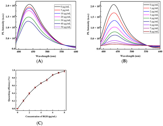 Upon addition of RGO into the conjugate (Anti-Lv-mAb/CQDs), FRET could be observed for energy nonradioactively transferred from the conjugate to RGO. The PL quenching depends on the concentrations of RGO (Figure 5A). Our experimental results indicate that the FRET efficiency between conjugate and RGO is not good. Within 5–40 µg/mL concentrations of RGO, the fluorescent quenching ratios increase with the concentrations of the RGO; however, the highest quenching efficiency is only 40%; thus, the FRET efficiency between RGO and CQDs is very low. The main reason is that the electrostatic interaction between RGO and CQDs is very weak for both with negative surface charges; the static-electronic repulse force between the two hindered CQDs from attracting RGO. After PDDA modification, the Zeta potential of RGO_PDDA became positive, indicating positive surface charge, which is a benefit of the electrostatic attraction between RGO_PDDA and CQDs; thus, FRET efficiency can be significantly improved. The experimental result proved this analysis (Figure 5B). When the concentration of RGO_PDDA is 8.0 µg/mL, the quenching efficiency is almost 1 (Figure 5C), which means the entire PL from the conjugate was completely quenched by RGO_PDDA, and the modification of RGO with PDDA is a benefit of the FRET between CQDs and RGO; thus, 8.0 µg/mL RGO_PDDA was selected as the best amount for Vtg detection.