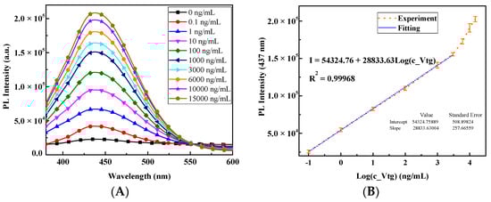 (A) PL “ON” of Anti-Lv-mAb/CQDs/RGO_PDDA after addition of different concentrations of Vtg (0.1, 1.0, 10, 100, 1000, 3000, 6000, 10,000, and 15,000 ng/mL); (B) the PL regaining intensities with the logarithm concentrations of Vtg; the linear range is from 0.1 ng/mL to 3000 ng/mL.