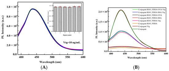 Reproducibility, selectivity, and stability of the immunosensor were shown in Figure 7. After adding the same amount of Vtg (10 ng/mL) into six parallel samples of conjugate/RGO and incubating for 15 min at room temperature, the PL spectra of the mixture were measured, and the results were presented in Figure 7A. Six duplicate groups showed the relative standard error of 1.63%, indicating the immunosensor has good repeatability. The selectivity of the immunosensor was tested by using bovine serum albumin (BSA) and ovalbumin (OVA, derived from egg white) as interferences. As shown in Figure 7B, for 10 ng/mL Vtg, 1000 ng/mL BSA, and 1000 ng/mL OVA, the PL regaining ratios are 41.75%, 4.23%, and 2.86%, respectively. The PL regaining ratio for Vtg is much higher than that for BSA and OVA, implying that the “ON-OFF” immunosensor has good selectivity for Vtg. Compared to the Ref. [29], the CQDs-based immunosensor has better selectivity. After one week of storage at 4 °C, the PL strength of the Anti-Lv-mAb/CQDs conjugate only lost 5%, indicating stable operation of the Anti-Lv-mAb/CQDs conjugate in a short period of time. CQDs is very stable even at room temperature for several months [35]. Anti-Lv-mAb/CQDs/RGO_PDDA/Vtg can be kept constant for 8 h at room temperature or 3 days at 4 °C. The Anti-Lv-mAb and CQDs can also be stored separately and mixed at the time of the experiment.