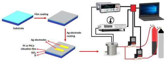 In order to obtain a resistive sensor device, two silver contacts separated by 1 mm are coated onto the pure Pt and alloy PtCo ultrathin films by a thermal evaporator system (PVD system-NONOVAK 400). The electrical resistances of the thin film sensor devices are continuously measured under different ambient conditions in a home-made measurement cell by using Keithley 2700 Multimeter. Figure 1 shows a schematic illustration for fabrication of sensor device and gas-sensing measurement setup. The dry air is used as a carrier gas, the H2 concentration is changed from 10 ppm to 5%, and the temperature is varied with Lakeshore 335 temperature controller between 25 °C and 150 °C by using a heater in the measurement cell. The gas concentration is varied with two Alicat mass flow controller.