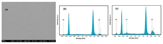 Figure 2a shows the SEM image of one Pt0.5Co0.5 film sample from where one can infer the surface of the film is smooth, with no segregation of Pt0.5Co0.5. Similar SEM results are obtained for the other Pt and PtCo alloy ultrathin films. The EDX spectrums of pristine Pt and Pt0.75Co0.25 ultrathin films are given in Figure 2b,c, respectively. Pt and Co peaks are marked on Figure 2b,c and the remaining peaks come from Si/SiO2 substrate. The atomic percentage rate of Pt and Co for Pt0.75Co0.25 alloy ultrathin films are obtained so close to our expectation from the EDX spectrum as 75.74% and 24.26%, respectively. Similarly, values very close to what we expected during production are obtained from the EDX spectra of other PtCo alloy ultrathin films. The XRD spectra of pristine Pt and Pt0.5Co0.5 thin films are seen in Figure 3a. The peak near 40° comes from Pt (111) plane reflection, and that corresponds to a face-centered cubic crystalline structure [37]. Peak positioned at around 33° corresponds to Si (200) plane reflection that comes from SiO2/Si substrate. The (111) plane peak position for pristine Pt is approximately 39.9°, and this peak position is shifted to 40.5° for the Pt0.5Co0.5 alloy film. This behavior could be explained with the lattice contraction because of the partial substitution of Pt atoms by Co atoms and is the evidence of PtCo alloy formation. Similar diffraction peak shift is observed for Pt-Co alloy nanoparticles synthesized with different methods [38,39], for Pt-Co alloy nanocrystals synthesized via colloidal synthesis [40], and for Pt-Co alloy network nanostructures synthesized by wet-chemical synthetic method [41].