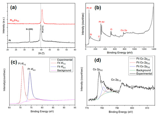 XRD spectrum of pristine Pt and Pt0.5Co0.5 alloy thin films (a); the full XPS survey of Pt0.75Co0.25 thin film sample (b), Pt 4f region (c), and of Co 2p region (d) XPS spectra of Pt0.75Co0.25 alloy thin film.