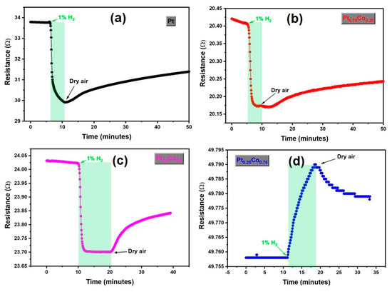 The resistance over time for (a) pure Pt, (b) Pt0.75Co0.25, (c) Pt0.5Co0.5, and (d) Pt0.25Co0.75 thin film samples, upon injection of H2 and air at room temperature.