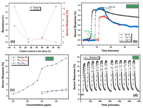 (a) Resistance and sensor response of the films exposed to 1% hydrogen as a function of Co content at room temperature, (b) sensor response versus time for Pt0.75Co0.25 alloy thin film at 25 °C, 100 °C, and 150 °C exposed to 1% hydrogen, (c) sensor response as a function of logarithmic concentration for pristine Pt, Pt0.75Co0.25, and Pt0.75Co0.25 alloy thin films at 100 °C and (d) stability cycles of pristine Pt at 50 °C.