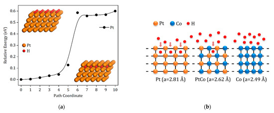 Hydrogen diffusion energy barrier for pristine Pt thin film (a) and a schematic illustration for hydrogen penetration into Pt, Pt0.5Co0.5, and Co (b).