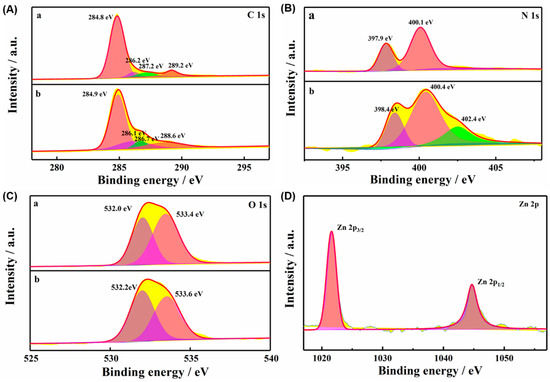 In addition, the surface C 1s, O 1s, N 1s, and Zn 2p elements of TCPP-Zn-(S)-BINOL were further studied by XPS. The peaks at 284.9 eV, 286.1 eV, 286.7 eV, and 288.6 eV, shown in the C1s XPS spectrum (Figure 3A), are contributed by C−C SP2, C=N, C−N, and π−π* [27]. In the porphyrin monomer, the N1s XPS spectrum showed two signals, which were assigned to the iconic and pyrrolic nitrogens, respectively. Meanwhile, in TCPP-Zn-(S)-BINOL, as shown in Figure 3B, after metallization, a Zn-N peak at 402.4 eV was detected. From the surface O 1s element of TCPP (Figure 3C, image a), it can be seen that the peak centered at 532.0 eV can be attributed to the C=O bond, while the peak of 533.4 eV is related to the C−OH group [28]. After the reaction of Zn with TCPP, the peak intensity at 533.6 eV was significantly reduced (Figure 3A, image b), indicating that the carboxyl groups in TCPP were successfully coordinated with Zn2+. The XPS spectrum in Figure 3D also clearly shows the Zn 2p3/2 and Zn 2p1/2 compositions at 1021.9 and 1045 eV. The results of XPS spectra further proved that Zn was successfully coordinated with TCPP and verified the successful preparation of the porphyrin-based MOF.