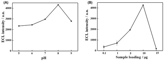 The experimental conditions, including pH and sample loading, were optimized as they affected the ECL intensity of the electrode. In order to determine the optimal pH value of the reaction solution, electrolytes with different pH values were first prepared, and the ECL properties of TCPP-Zn-(S)-BINOL/GCE were tested under the same experimental conditions. It can be seen from Figure 5A that the ECL intensity of TCPP-Zn-(S)-BINOL/GCE first increases with the increase in pH value. When the pH value of the electrolyte is 8, the ECL intensity reaches the maximum value. Subsequently, with the increase in pH value, the ECL intensity decreases. This may be because the material is unstable under the condition of being too acidic or too alkaline, resulting in the reduction in ECL to varying degrees. Therefore, pH 8.0 is the most suitable for optimum ECL measurement.