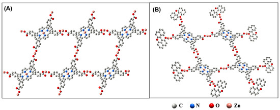 Schematic illustrations for the structure of (A) TCPP-Zn and (B) TCPP-Zn-BPS.