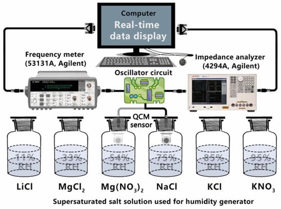 The schematic diagram of the QCM sensor humidity detection system was shown in Figure 1. Different RH conditions in the detection system were set up by using different kinds of supersaturated salt solutions [30,31]. One end of the self-made vibration starting circuit was connected to the modified QCM humidity sensor, and the other end was connected to the high precision frequency meter (53131A, Agilent) to monitor the oscillation frequency of QCM in real time. In addition, QCM sensor was also connected with an impedance analyzer (4294A, Agilent), and the admittance spectrum of QCM in the resonant range was recorded by frequency sweep to obtain the electroacoustic parameters of the sensor.