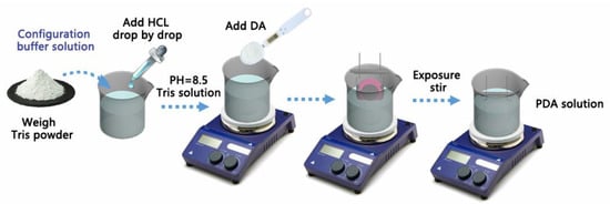 The synthesis of polydopamine (PDA) was a kind of polymer which was self-polymerized by using dopamine hydrochloride (DA) as a polymeric monomer in buffer solution [32]. The detailed material synthesis and sensor fabrication steps were shown in Figure 2.