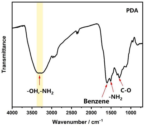 The synthesized PDA material was tested by FT-IR to identify the surface functional groups. As shown in Figure 3, the slightly wider band located around 3400 cm−1 corresponds to the stretching vibration of hydroxyl (O-H) and amino (N-H) groups. The bands nearing 1602 cm−1 and 1500 cm−1 correspond to the skeleton vibration of the aromatic ring carried by the PDA and the vibration between N-H within the -NH2 group. The absorption peak at 1268 cm−1 corresponds to C-O stretching vibration. The above results were basically consistent with the previous reports [34], which indicated that we have successfully synthesized PDA materials, and no other impurities were mixed in the reaction process.
