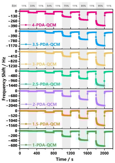 The response-recover curves of 1-PDA-QCM, 1.5-PDA-QCM, 2-PDA-QCM, 2.5-PDA-QCM, 3-PDA-QCM, 3.5-PDA-QCM, 4-PDA-QCM at the relative humidity between 11% and 95%.