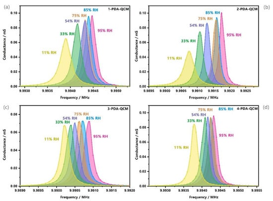 Admittance curves of (a) 1-PDA-QCM, (b) 2-PDA-QCM, (c) 3-PDA-QCM, and (d) 4-PDA-QCM humidity sensors in the range of 11% RH to 95% RH.