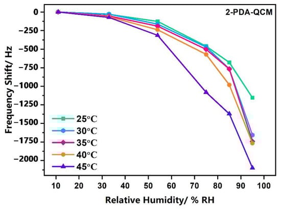 The frequency response curves of the 2-PDA-QCM humidity sensor from 11% RH to 95% RH in the temperature range from 25 °C to 45 °C were tested, and the results were shown in Figure 7. The results showed that the frequency shifts of the sensor increased with the increase in temperature. When the temperature has risen to 45 °C, the frequency shift of the sensor would increase significantly, and the change of the frequency shift of the sensor was not very big when the temperature around 25 °C. Therefore, although the high temperature resistance of the sensor still needs to be further improved, the output frequency shift of the QCM humidity sensor was relatively stable for common humidity detection at room temperature.