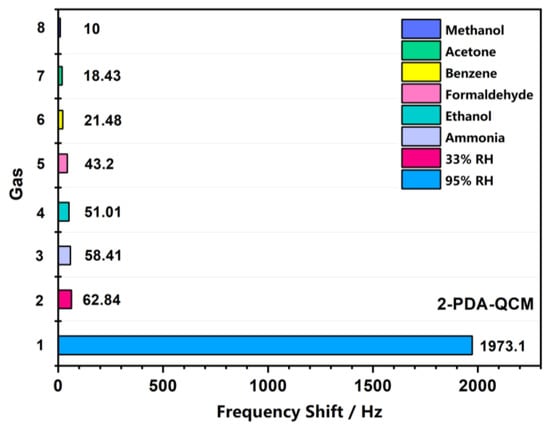 In the actual use of the sensor, the presence of other interfering gases might affect the test results. In this experiment, ethanol, ammonia, acetone, methanol, formaldehyde and benzene with a concentration of 500 PPM were selected as interference gases. Figure 8 compared the frequency shifts of 2-PDA-QCM humidity sensor to several interfering gases, 33% RH and 95% RH. From the results, the frequency shift of the sensor to humidity was significantly better than other interfering gases, which indicated that the sensor owned acceptable selectivity. Because the QCM sensor could work at room temperature, it should be emphasized that the majority of the adsorption of target molecules occurred by physical adsorption. Additionally, the rate of adsorption and desorption was rather quick and could be entirely desorbed. However, because of these features, the sensor would respond to some interference targets. Therefore, it is still worthwhile to investigate the issue of sensor cross-sensitivity for future applications.