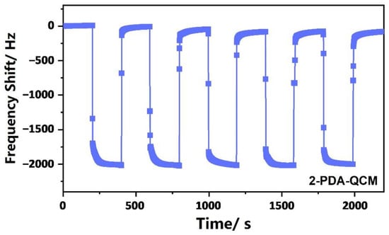 In order to evaluate the repeatability of the QCM humidity sensor, the 2-PDA-QCM was periodically and repeatedly exposed to 11% and 95% RH. As shown in Figure 9, the sensor has good repeatability in five cycles of testing.