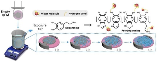 The working principle of QCM humidity sensor based on PDA humidity sensitive material was mainly to use the hydrophilic groups (amino group, hydroxyl group, etc.) of the humidity sensitive material itself to adsorb water molecules reversibly. The substrate was immersed in an alkaline aqueous solution of dopamine, and PDA coating spontaneously formed on the surface of the substrate after several minutes to hours. The schematic diagram is shown in Figure 10.